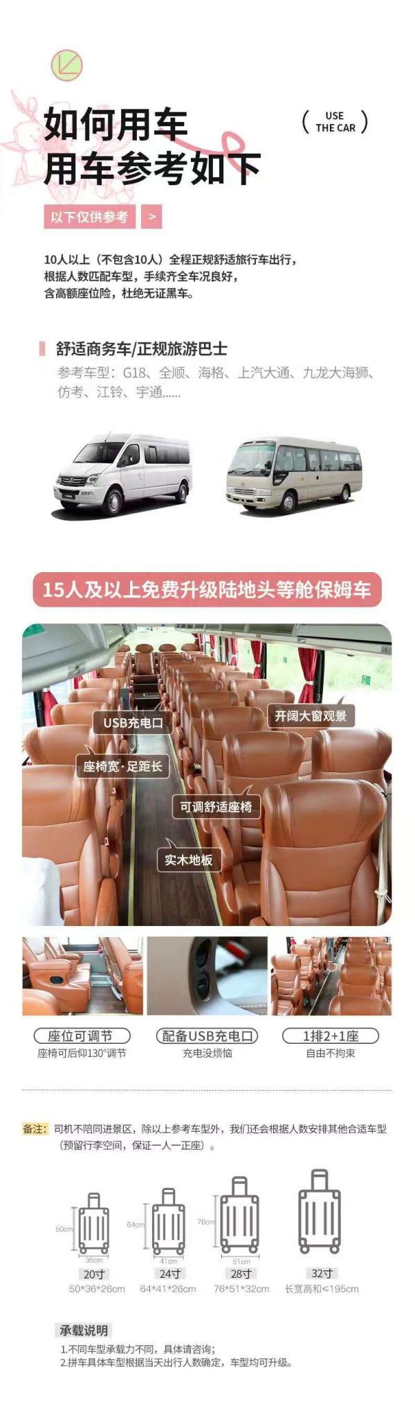 為保證成團(tuán)及質(zhì)量,根據(jù)人數(shù)派不同座位數(shù)用車,保證每人一正座;