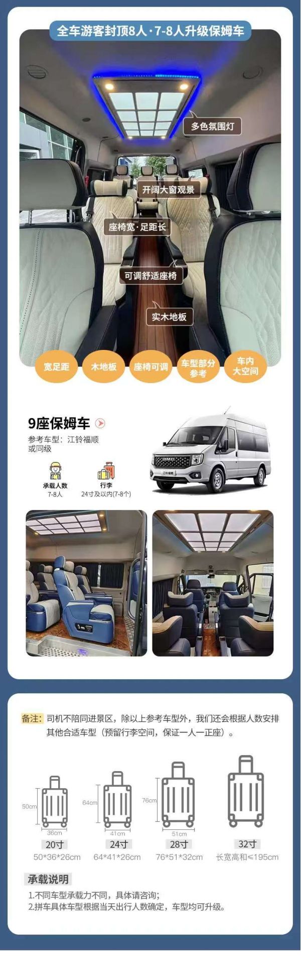 為保證成團及質(zhì)量,根據(jù)人數(shù)派不同座位數(shù)用車,保證每人一正座;