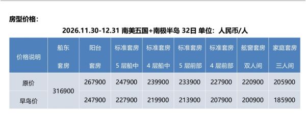 早鳥價: 除船東套房外,其他房型早鳥價立減 2 萬元/人,優(yōu)惠截止于 2026/2/28備注: 6人起發(fā),10人起派領隊,需自備美簽