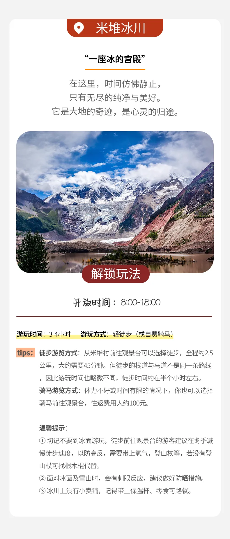 米堆冰川門票50元/人、觀光車20元/人、騎馬100元/人;