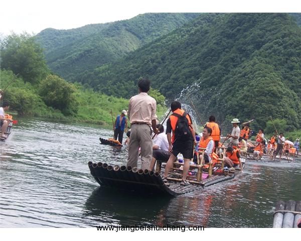 【竹筏漂流】全長水路3.5公里,歷時一小時左右,由專業(yè)筏工點篙撐筏,順莫干山、天目山支流匯合雙溪而下,每筏限坐游客八人,每人配備救生衣1件。溪水清澈明凈,水面時有翠鳥、鴨子、白鷺等出沒,兩岸茶山蔥籠,淡竹林綿延不絕,溪邊有“苧翁垂釣”、“村姑搗衣”,實屬一幅天然水墨風情畫,都市喧囂在此蕩然無存,人在畫中游,置身于秀美山水之間,使人悠然自得,心曠神怡。