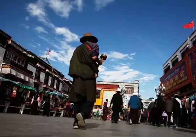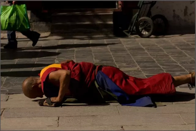 八廊街被藏族人稱(chēng)為圣路,因此有許多磕長(zhǎng)頭的佛教信徒活躍于此,許多信徒也愿意成為攝影師們的擺拍模特。