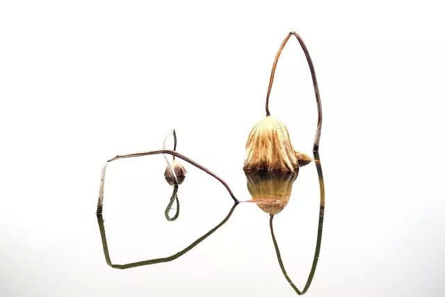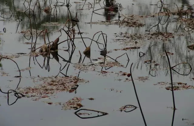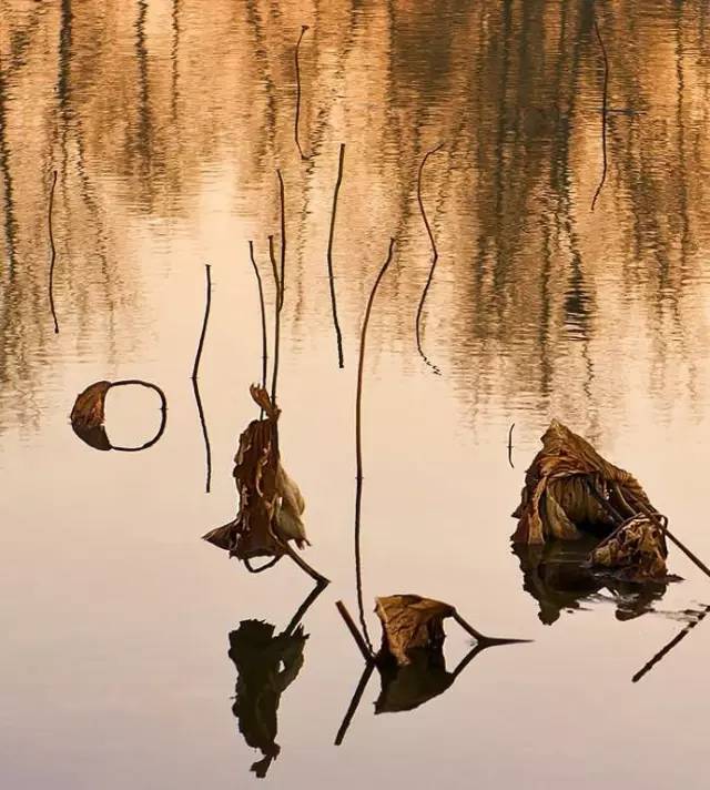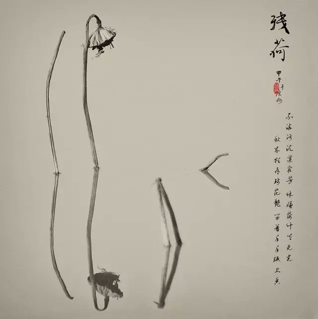 利用水中倒影來表現(xiàn)殘荷,使其增添一份凄清真實(shí)中帶著虛幻的味道。