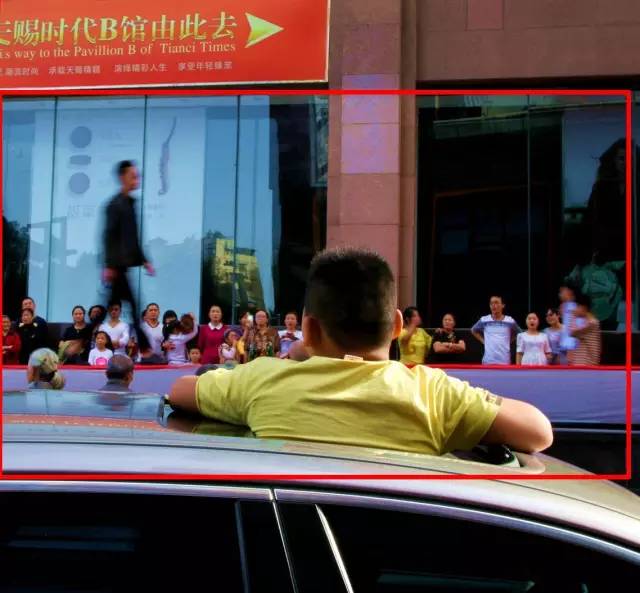 點(diǎn)評(píng):T臺(tái)表演者的虛化,靜止清晰的男孩,慢速拍攝能更好地表現(xiàn)虛實(shí)、動(dòng)靜的對(duì)比。但是,作者采取正方形的構(gòu)圖不妥,左上角的紅色廣告牌有些搶?xiě)颍虏康能?chē)窗影響視線。剪裁后,畫(huà)面更簡(jiǎn)潔明了。