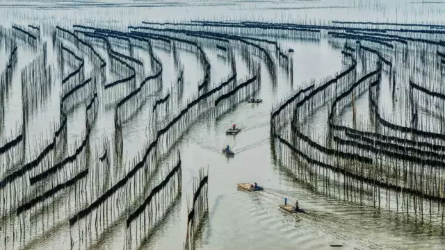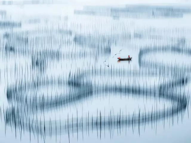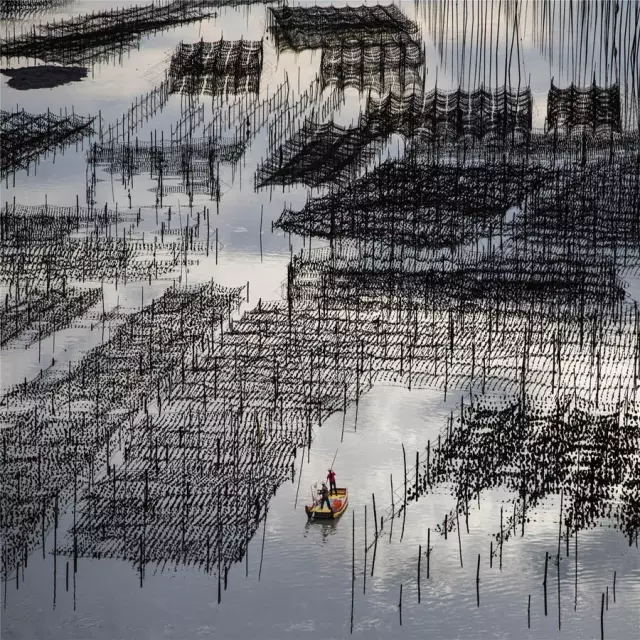 霞浦灘涂大面積的海上養(yǎng)殖,為灘涂添加了線條和規(guī)則的幾何圖案,可以利用這些圖案組成單一節(jié)奏感很強(qiáng)的畫(huà)面。