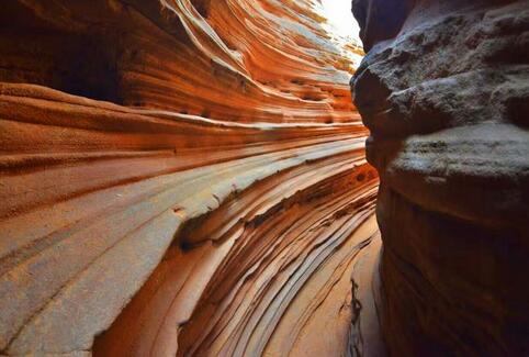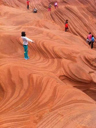 波浪谷是一種紅砂巖地貌,因巖砂上的紋路像波浪,被叫做"TheWave",即波浪。上世紀(jì)80年代,人們?cè)诿绹?guó)亞利桑那州和猶他州交界處發(fā)現(xiàn)了波浪谷,神奇的外觀(guān)和極高的科研價(jià)值使其成為了世界八大巖石奇觀(guān)之一。而靖邊的波浪谷也有著與美國(guó)波浪谷媲美的紅砂巖峽谷。中國(guó)靖邊波浪谷和美國(guó)波浪谷的差距并不大,都是紅砂巖地貌,靖邊波浪谷更加年輕,只有6000萬(wàn)年,很多砂土還沒(méi)來(lái)得及凝固為巖石,地處黃土高原與毛烏素沙漠交匯地帶的靖邊縣龍州鄉(xiāng)。