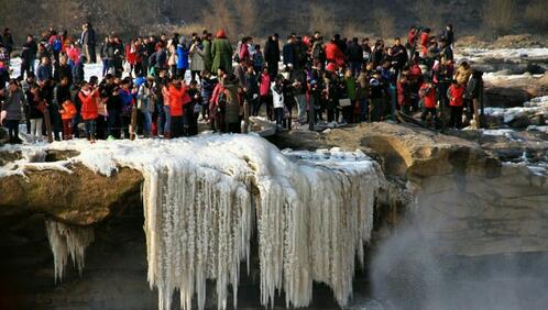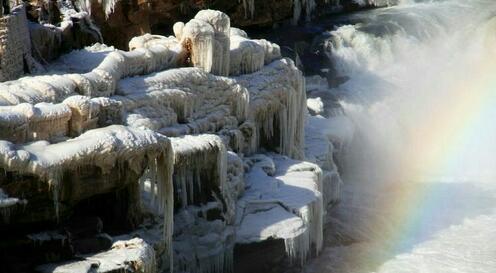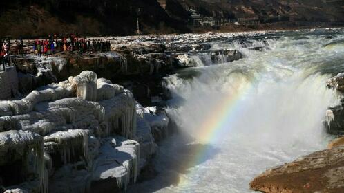 觀(guān)賞黃河壺口瀑布黃河壺口瀑布,其奔騰洶涌的氣勢(shì)如同中華民族的精神。它西臨陜西省延安市宜川縣壺口鄉(xiāng),東瀕山西省吉縣。黃河至此兩岸石壁峭立,河口收束狹如壺口,故名壺口瀑布。瀑布落差9米,蘊(yùn)藏豐富的水力資源。奔騰的黃河水聲震天地,絢麗的彩虹美輪美奐,輕煙生水底,冰掛透晶瑩,黃河壺口冬季美麗的自然景觀(guān)讓游人們流連忘返。