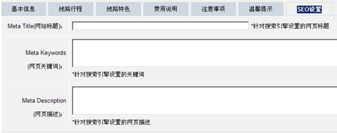 (2)(網(wǎng)頁(yè)關(guān)鍵詞):針對(duì)搜索引擎設(shè)置的關(guān)鍵詞 填寫(xiě)線(xiàn)路內(nèi)包含的景區(qū)景點(diǎn)名稱(chēng),以及涉及到的地名!(如:洲、國(guó)家、省份、市、區(qū)、縣等地名)