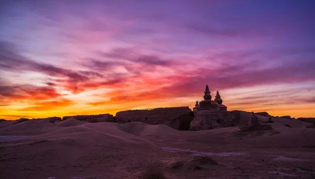 我們將在怪樹(shù)林欣賞大漠落日,看滾滾落日從地平線上姍姍落下,形態(tài)各異的枯枝在大漠上畫(huà)出蜿蜒的影子,觀賞完日落之后便乘車(chē)前往今晚入住地——額濟(jì)納旗。