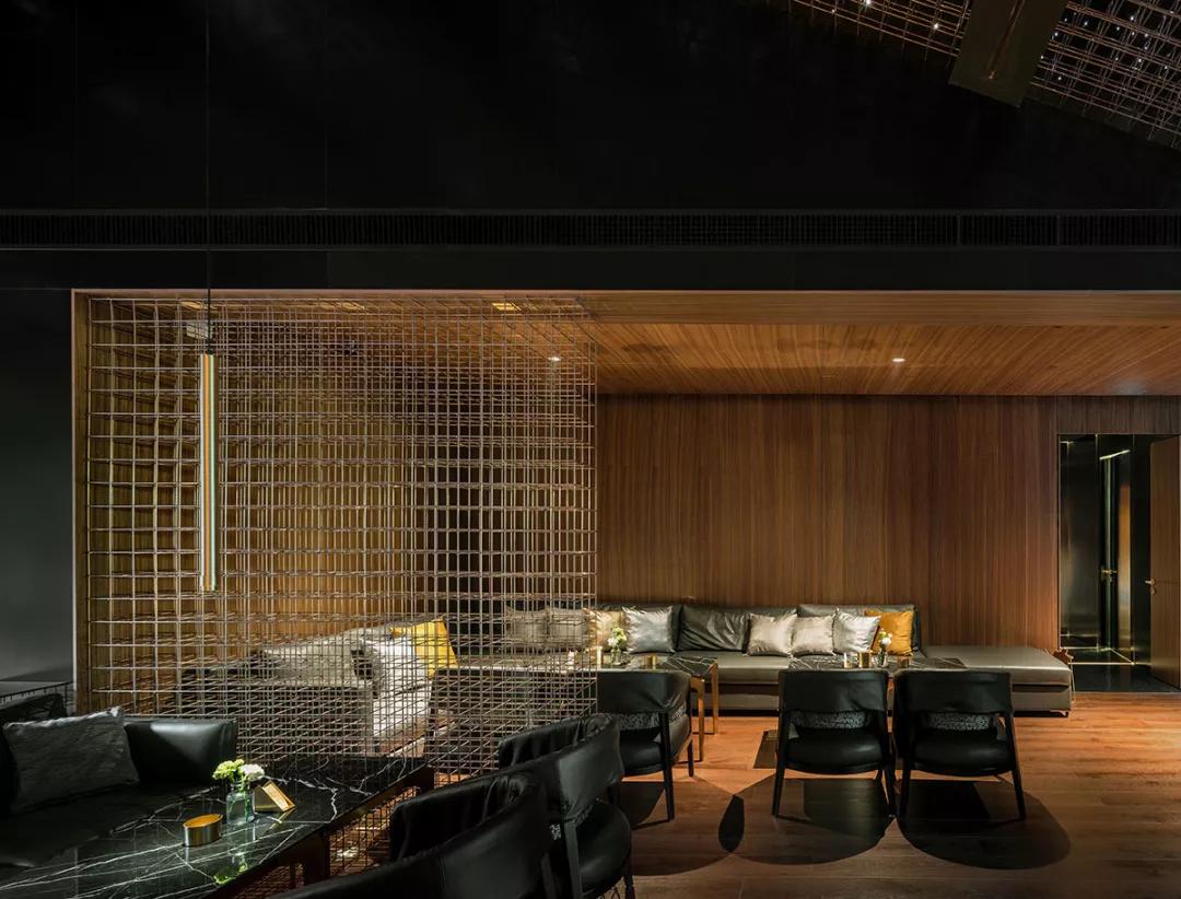 酒吧區(qū)域是一個(gè)動(dòng)態(tài)空間,室內(nèi)的現(xiàn)代化裝飾則與外界古色古香的建筑群形成強(qiáng)烈對(duì)比,數(shù)字化設(shè)計(jì)的黃銅立體網(wǎng)格結(jié)構(gòu)貫穿室內(nèi),將酒吧的各個(gè)空間串聯(lián)在一起。延伸的吧臺(tái)、舞動(dòng)的頂面、變換的星空頂燈制造出不同的視覺感受,引導(dǎo)人逐個(gè)探索每一個(gè)角落。酒吧區(qū)沒有采用尋常酒吧中常見的電視、投影設(shè)備以最大程度減少對(duì)人的擾動(dòng),營(yíng)造一個(gè)可以靜思、可以真正意義上產(chǎn)生思想碰撞的空間。KTV舞動(dòng)的頂面造型設(shè)計(jì)以數(shù)字矩陣為靈感,也是虛擬未來的象征。不同模式的燈光演繹讓音樂在這有了實(shí)體的呈現(xiàn)方式,音樂的流動(dòng)可以被視覺捕捉,活躍了整體空間的同時(shí)也增加了多感官交流。