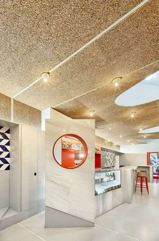 考慮到公共場(chǎng)所的聲學(xué)要求,室內(nèi)天花板和部分側(cè)面已經(jīng)覆蓋了軟木面板,這是一種吸音材料,因此可以避免混響,也可以減少對(duì)鄰居的干擾。軟木飾面的塑料品質(zhì)被用作建筑的主要裝飾主題。這種材料其切割產(chǎn)生的條紋在原處和放置天花板的地方制造出韻律感,使得燈泡看起來像是懸浮著。在這個(gè)天花板上制作了一系列凹洞,突出了內(nèi)部的節(jié)奏,并尋求一種自然天頂照明的感覺。大部分的墻壁都有輔助工作條,與內(nèi)襯藍(lán)白相間的斜面瓷磚和白色瓷磚相一致。折疊屏風(fēng)、吧臺(tái)、高腳椅和桌子,每一種元素的奇異性賦予酒吧每個(gè)部分不同的性質(zhì),為尋找不同風(fēng)格座位的顧客創(chuàng)造不同的氛圍。