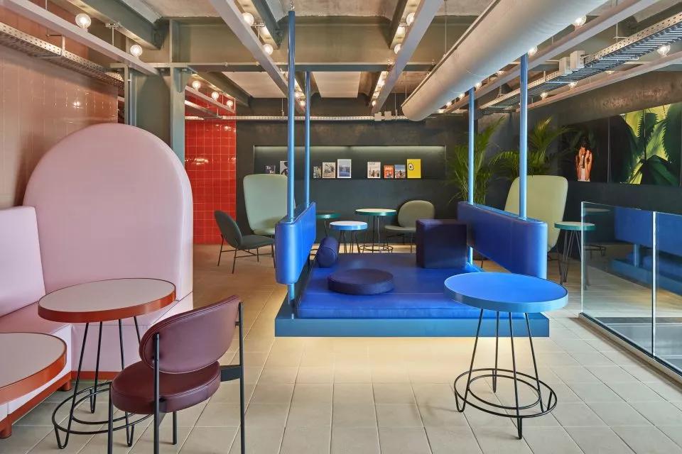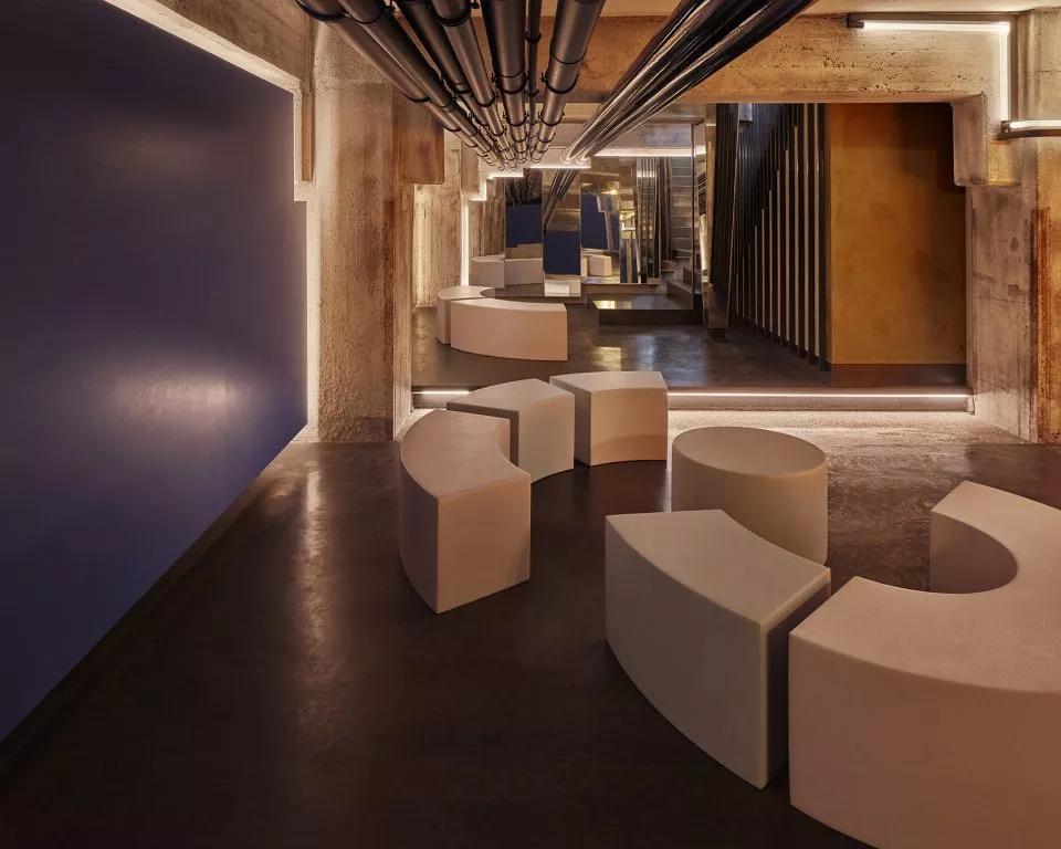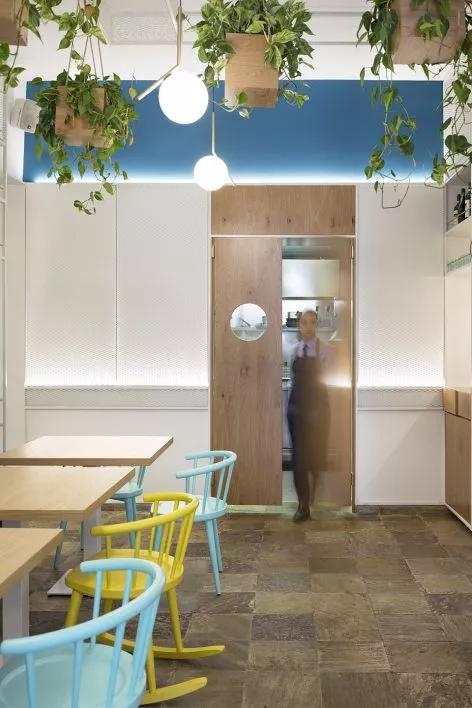 室內(nèi)的定制家具和精致的配色方案受到了陶瓷生產(chǎn)過程的啟發(fā):空間中的藍(lán)色、灰色、粉紅色和黃色涂料呼應(yīng)了生產(chǎn)工藝的開端,利用水和黏土塑造出類似于陶器模具的體量。陶器模具的形狀以及用于生產(chǎn)陶器的工具被再次利用,成為造型獨(dú)特的工業(yè)吊燈,并將室內(nèi)空間劃分為不同的區(qū)域。堅(jiān)硬的幾何形狀與柔軟黏土塑造出的形體共同構(gòu)成了大膽而和諧的內(nèi)部空間。