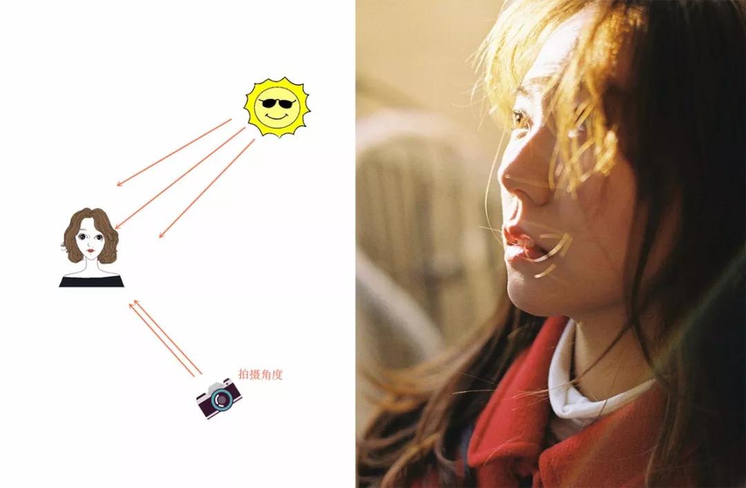 上面講的是逆光拍攝,還有一種是側(cè)逆光拍攝,當(dāng)太陽(yáng)光線處在模特左邊或者右邊,就是側(cè)逆光。