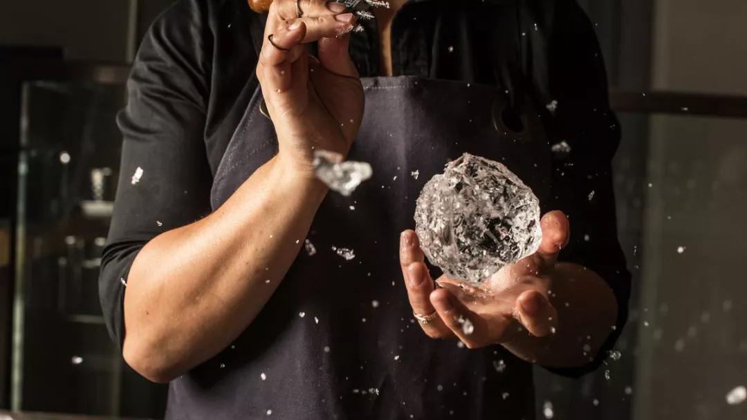 領(lǐng)悟到冰所攜帶的力量后,日本調(diào)酒師們很早便開始專研冰的藝術(shù)。所謂強(qiáng)將手下無弱“冰”,日本調(diào)酒師的手鑿冰球(Hand-carved ice balls)便是調(diào)酒界中的公認(rèn)精“冰”。他們會(huì)使用一些特殊器具,比如冰刀、冰鋸,來操練手中的冰塊。通常,他們先把一大塊巨冰切成小份,然后手拿“冰叉”鑿啊鑿,直到把冰塊鑿成球狀。聽起來很容易是嗎?但其實(shí),無任何保暖措施的手會(huì)被凍到毫無知覺,一個(gè)小小的失誤便會(huì)招來一趟醫(yī)院旅行。