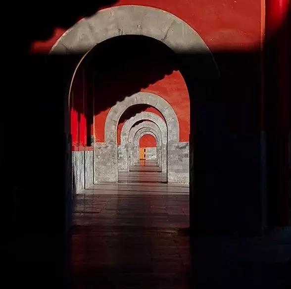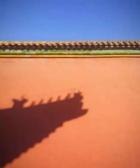 藍(lán)色的天空,紅色的宮墻,屋檐的影子打在宮墻上,加強(qiáng)了色彩的對比,讓畫面更加簡潔。