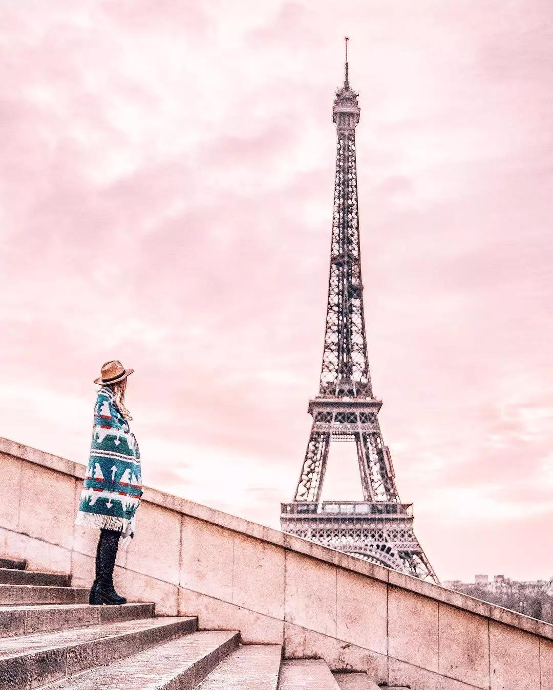 巴黎鐵塔邊的女孩,畫面以粉色調(diào)為主,洋溢著濃濃的浪漫主義風(fēng)情。