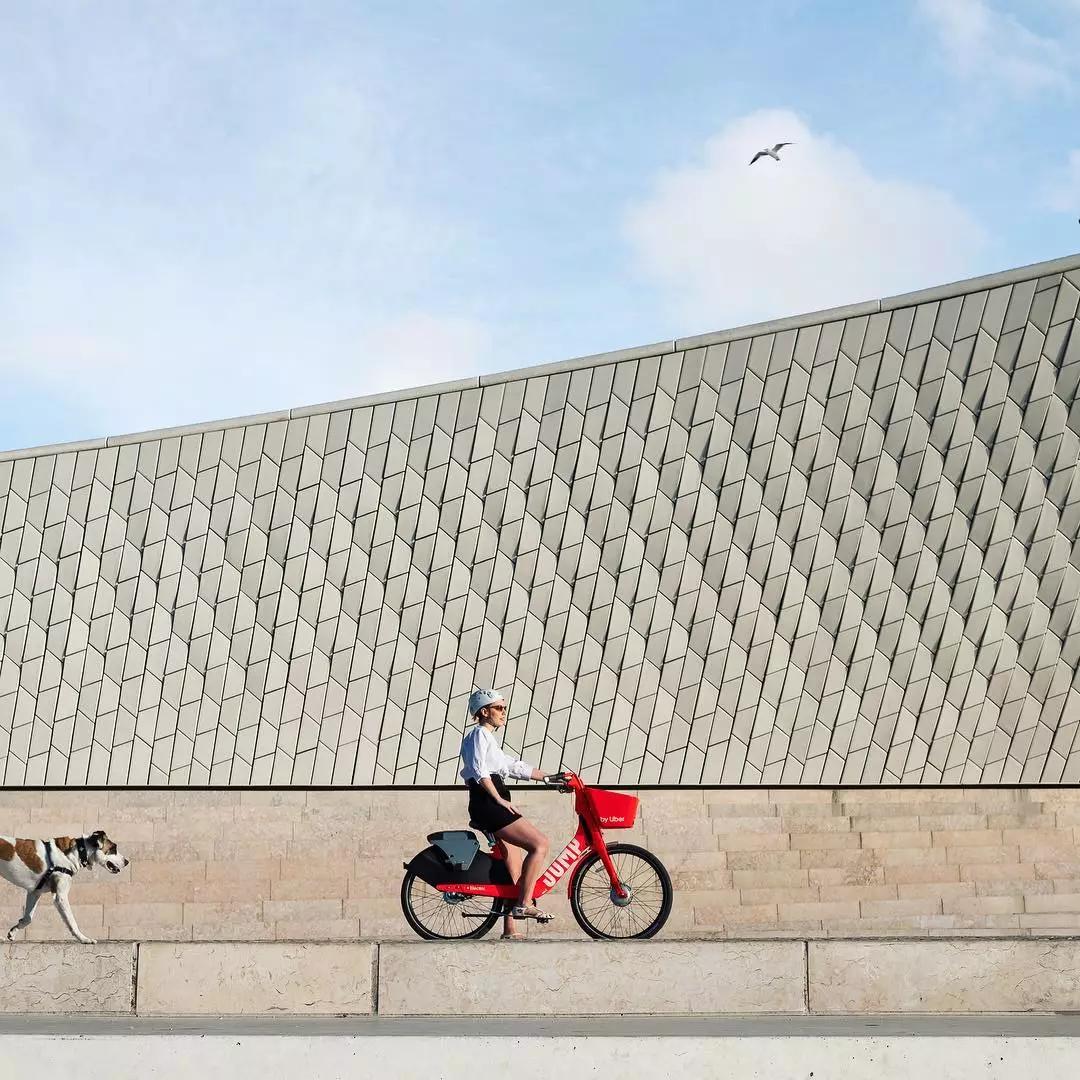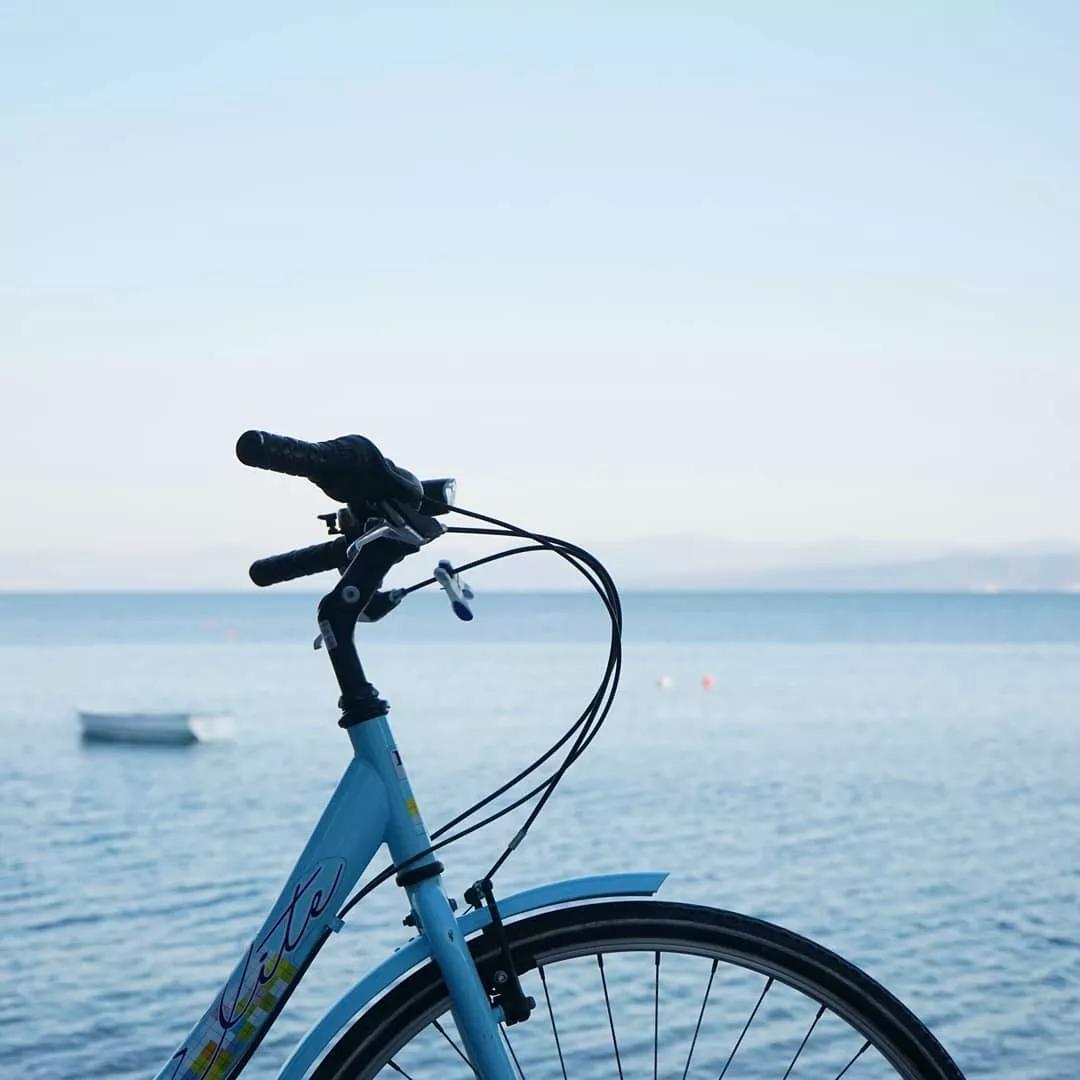 以虛化的大海與藍(lán)天為拍攝背景,畫面簡潔而干凈,將自行車的車頭作為近景拍攝的主體部分,藍(lán)色外觀與背景顏色相呼應(yīng),營造出一種清新靜謐感,同時(shí)也突顯出自行車的架構(gòu)。