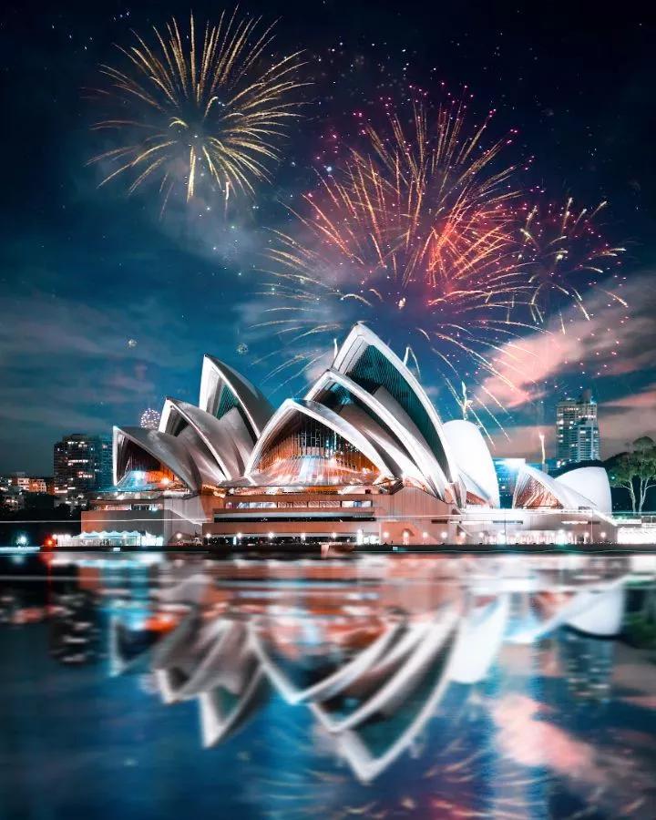 拍攝澳大利亞悉尼歌劇院,采用中景拍攝,將歌劇院特有的帆造型展現(xiàn)在觀者面前,感受建筑設(shè)計(jì)的獨(dú)特魅力,夜空中綻放的煙花讓畫面更有趣味性,烘托出熱鬧的氛圍。