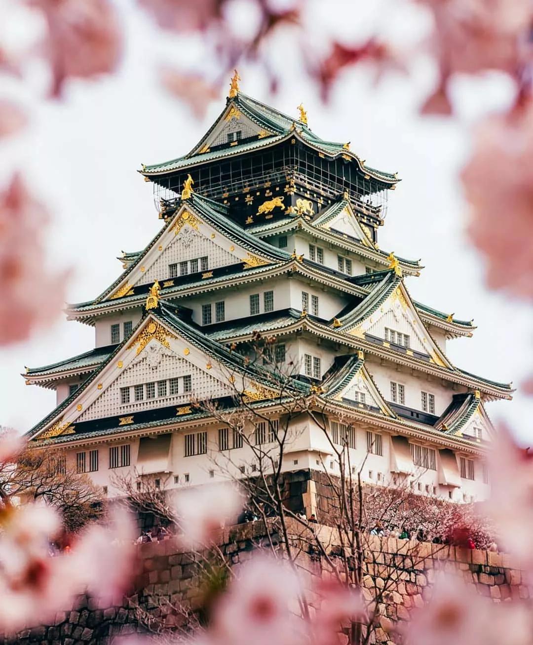 春季的日本大阪城天守閣,四周滿是櫻花,以櫻花為前景,將天守閣主體建筑放在畫面中,其巍峨雄偉的造型,鑲銅鍍金的外觀吸引著觀者的眼球。