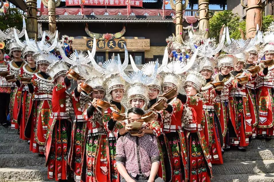 穿著盛裝的苗族姑娘們,端起小酒杯,邊舞邊唱,一時(shí)間敬酒歌四起。