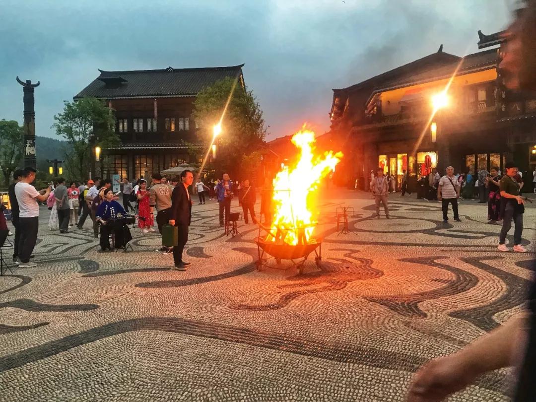 當(dāng)夜幕降臨,丹寨萬達(dá)小鎮(zhèn)上就開始熱熱鬧鬧的篝火晚會(huì)了,著盛裝的苗族姑娘牽手圍繞著篝火,翩翩的舞蹈,人們被歡樂的氛圍感染,忍不住參與其中。