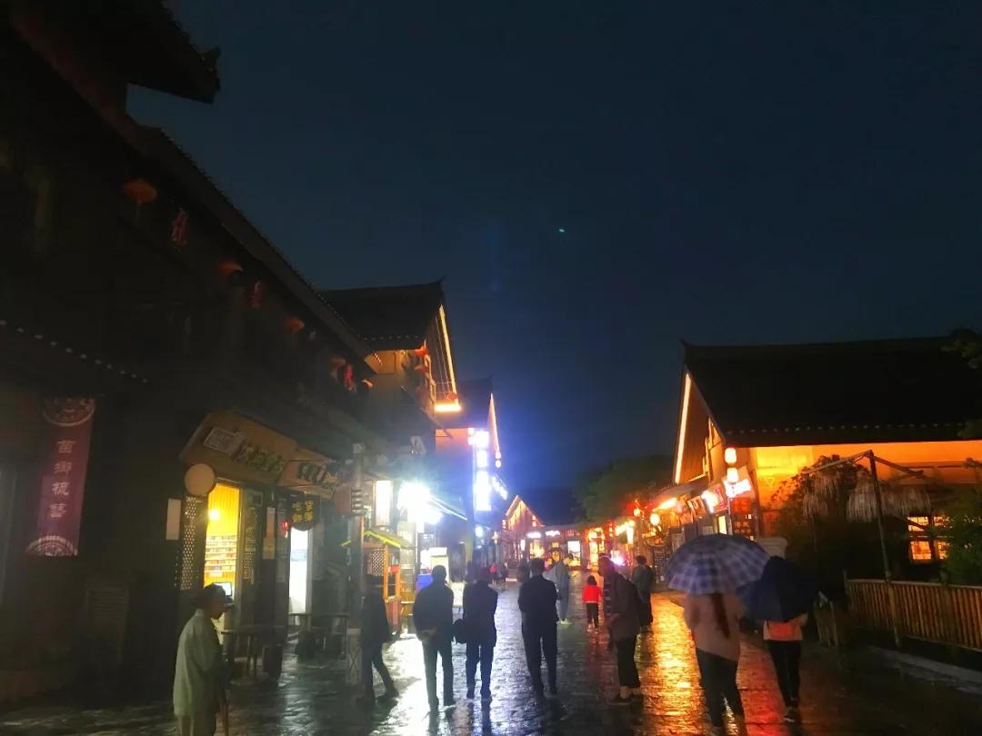 街道上的店鋪打開了燈光,遠(yuǎn)遠(yuǎn)望去,人們的熱情絲毫沒被雨水澆冷,大家或許和我一樣,貪戀小鎮(zhèn)的夜色吧。
