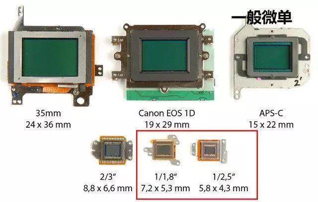 舉個例子,下圖中,紅色標框的是手機的感光元件,上面的是相機的,相差還是很明顯的。