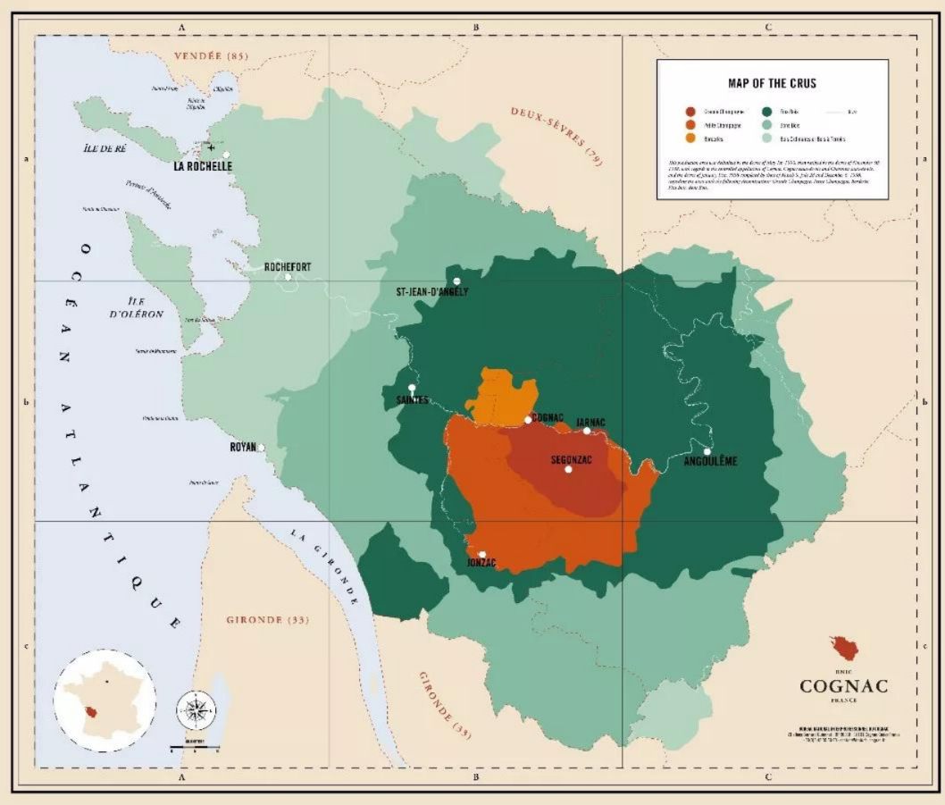 干邑產區(qū)位于法國西部,圍繞著同名的干邑市展開(Cognac)。如果你熟悉法國地理,你立刻就能發(fā)現(xiàn),干邑產區(qū)其實就在波爾多隔壁。