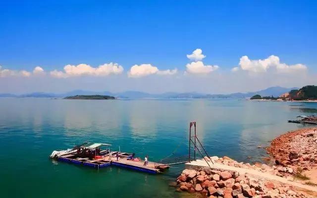 傍晚時分,林木茂密,水天一色,翠峰鵠立,湖中白帆點點,波光粼粼,一片寧靜淡泊的世外桃源景象。