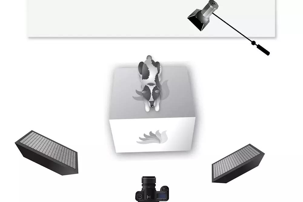 攝影師Mark C Hughes分享,他在攝影棚內(nèi)拍攝動(dòng)物時(shí)經(jīng)常采取的打燈方式——總共使用三個(gè)柔光箱(Softbox)、兩盞主光(Key light)分別從被攝物前方兩側(cè)45度角打光,再于后上方是只一盞發(fā)光(Hair Light)以點(diǎn)亮輪廓。這樣的配置能均勻照亮鏡頭前的主角,并使其與身后的背景分離開(kāi)來(lái)。