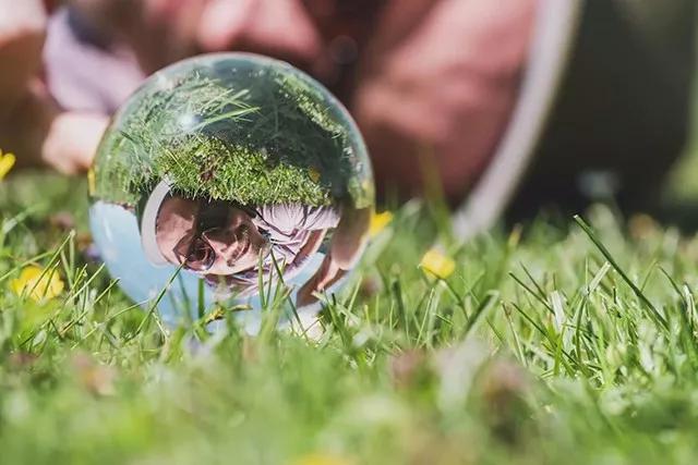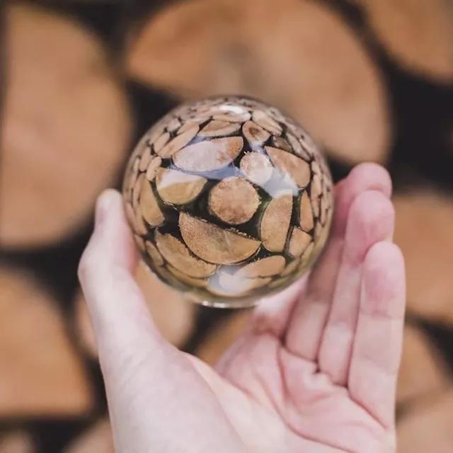 使用水晶球進行聚焦,不僅可以實現(xiàn)放大,還可以利用畸變來使紋理產(chǎn)生一定的變化感;再利用小/清晰虛像與大/模糊實景的對比,會讓作品顯得更有趣。