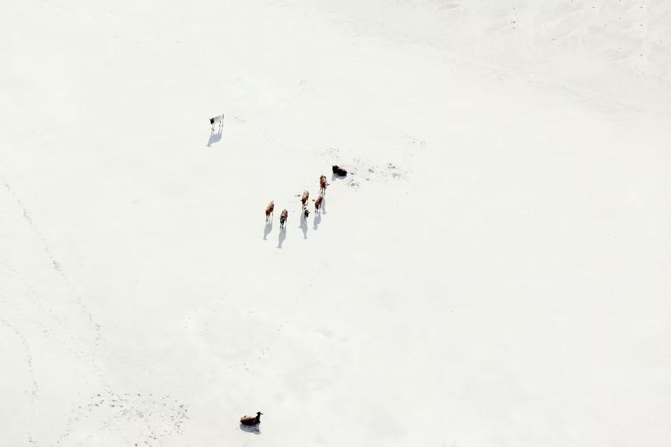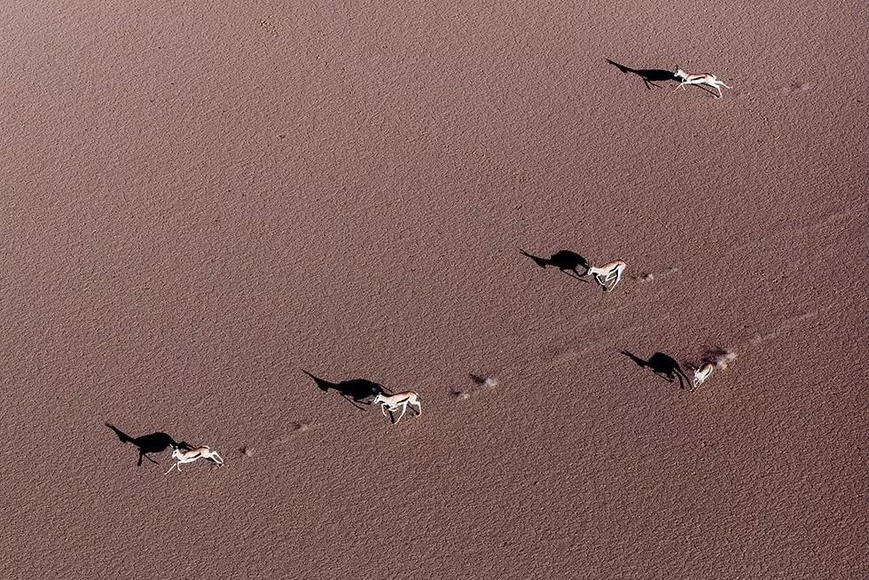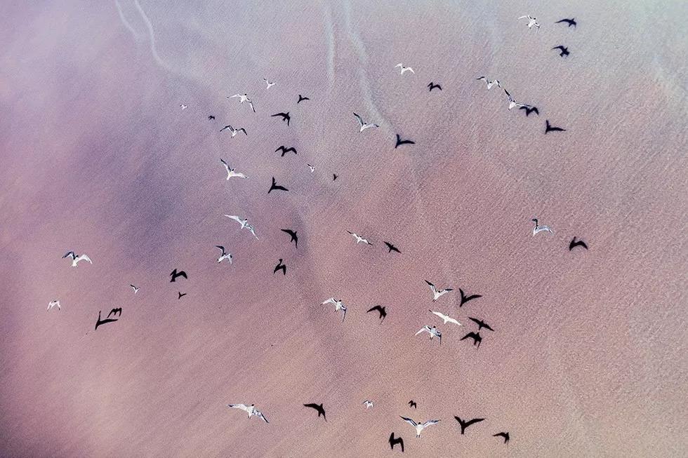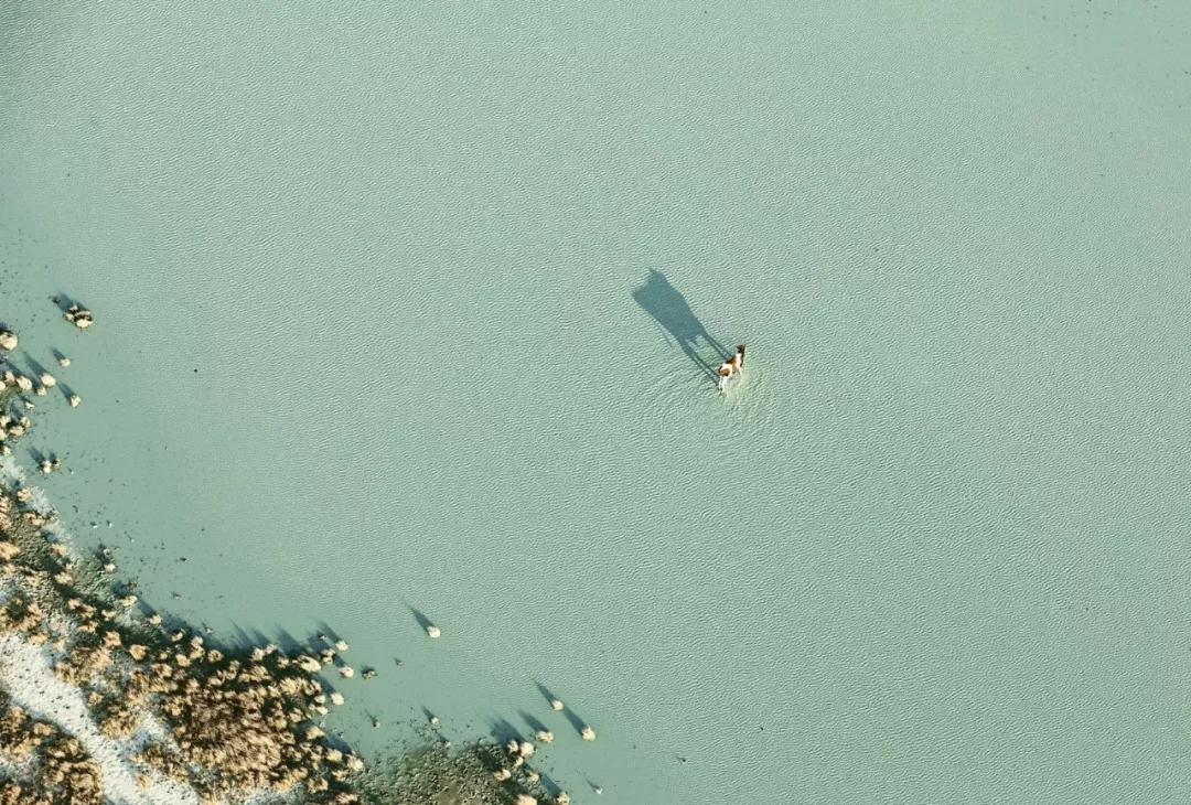 如火烈鳥、好望角大羚羊、甚至是一只在蔚藍(lán)的海水中休息的烏龜。動(dòng)物們行進(jìn)時(shí)留下的痕跡和陰影都是他作品中重要的組成元素。