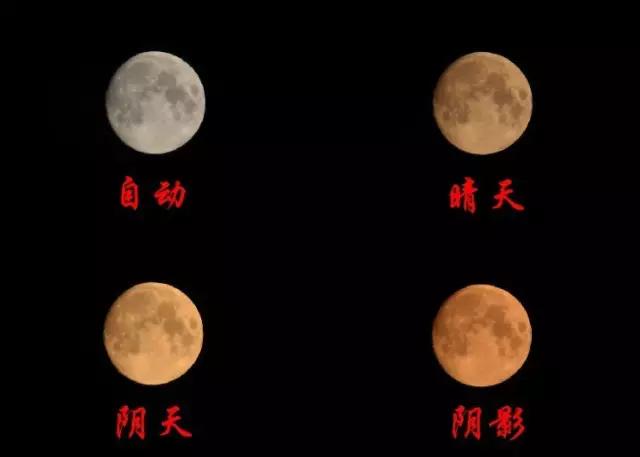 自動(dòng)白平衡,月亮很白;晴天白平衡,月亮微黃;陰天白平衡,月亮很黃;陰影白平衡,月亮不僅黃,而且發(fā)紅。