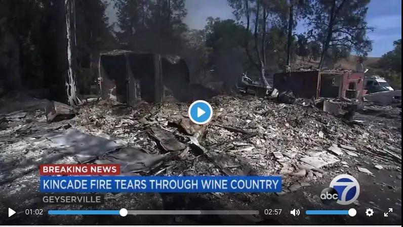 本次山火被稱為:Kincade,于美國(guó)當(dāng)?shù)貢r(shí)間10月23日夜晚發(fā)生,火勢(shì)猛烈,索多瑪縣北部上千名居民緊急撤離。至24日下午,火勢(shì)持續(xù)蔓延,Geyserville縣居民被迫疏散。加州州立大學(xué)、圣貝納迪諾市也因?yàn)橥k姾痛蠡鹪?4日停課。
