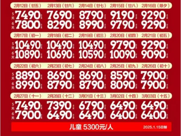 出團日期:2月12日(廿五)?2月13日(廿六)2月14日(廿七)2月15日(廿八)2月16日(除夕?)? 2月17日(初一)2月18日(初二)2月19日(初三)2月20日(初四)2月21日(初五) ?2月22日(初六)2月23日(初七)2月24日(初八)2月25日(初九)2月26日(初十) ?2月27日(十一)2月28日(十二)3月01日(十三)3月02日(十四)3月03日(十五?)?