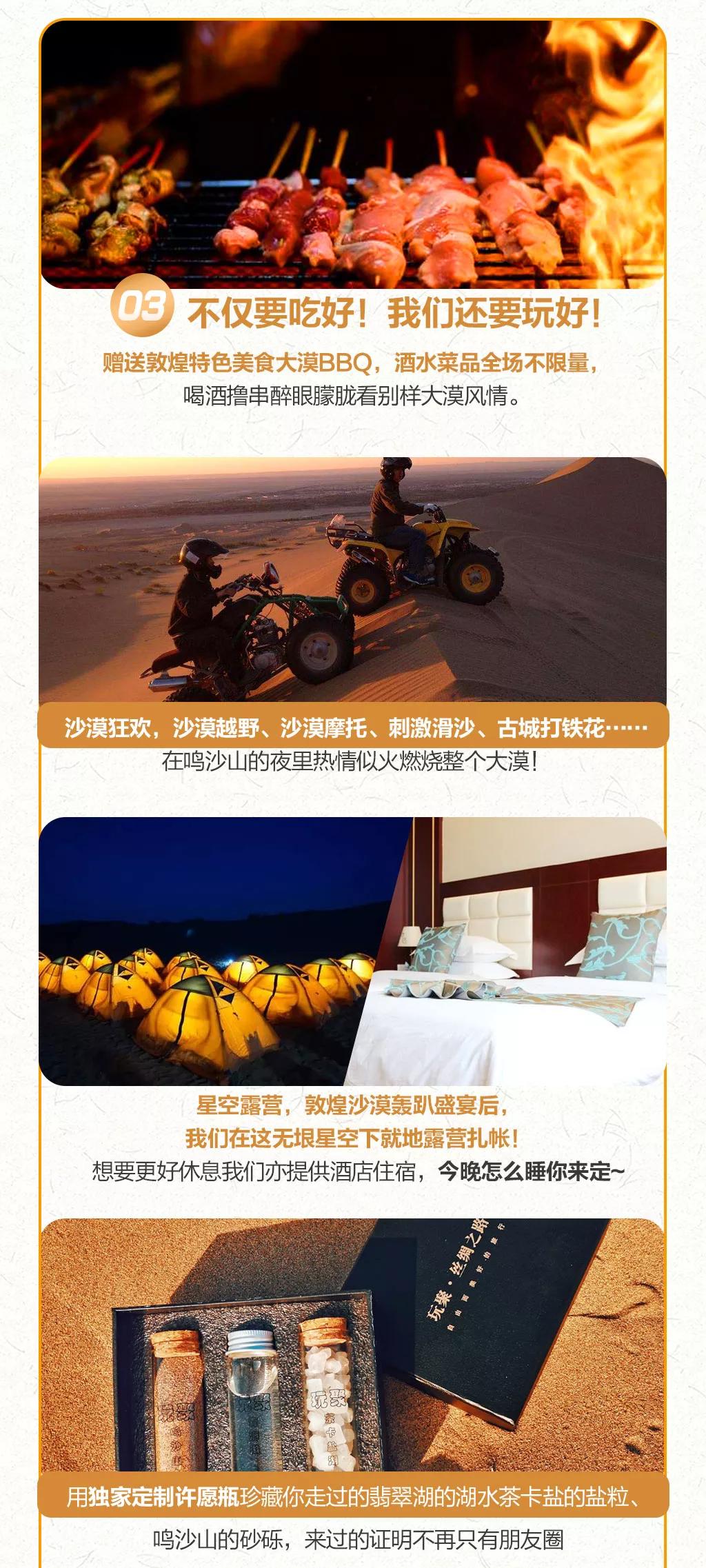 晚上在敦煌來(lái)一場(chǎng)絕無(wú)僅有的沙漠轟趴盛宴,沙漠越野、沙漠摩托、刺激滑沙、古城打鐵花……花樣玩法,玩累了咱們就坐地品嘗特別贈(zèng)送的沙漠BBQ,酒水菜品全場(chǎng)不限量,大家圍繞著篝火舞蹈,聞著燒烤的炭火香,暢飲著啤酒,品嘗已然備好的燒烤,在鳴沙山的夜里熱情似火燃燒整個(gè)大漠!
