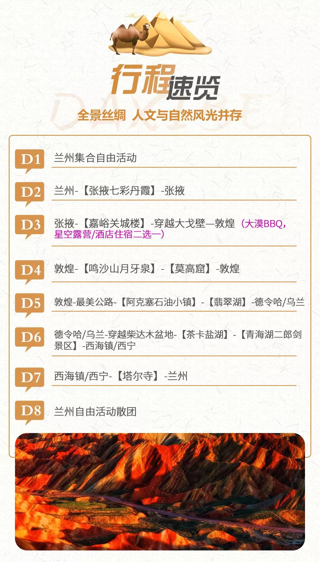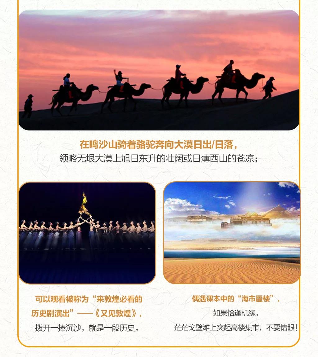 西北地區(qū)天氣干燥,旅途的過(guò)程中請(qǐng)大家多喝水,注意防曬;敦煌《又見(jiàn)敦煌》演出,旅游淡季298元/人,旺季368元/人起;果木烤全羊費(fèi)用根據(jù)羊的大小決定,由參與活動(dòng)的游客均攤,一般10人一桌,人均消費(fèi)160元左右。