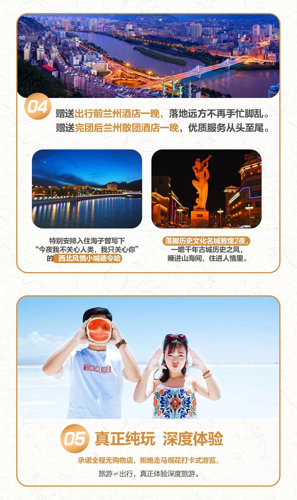 贈(zèng)送:贈(zèng)送特色敦煌沙漠BBQ;特贈(zèng)獨(dú)家定制許愿瓶禮盒,許你獨(dú)家記憶;贈(zèng)送貼心禮包旅游三寶、魔術(shù)頭巾、礦泉水;贈(zèng)送蘭州市區(qū)接機(jī)/接火車服務(wù),23點(diǎn)后由于運(yùn)管規(guī)定不能接機(jī)/接站,敬請(qǐng)諒解。(贈(zèng)送項(xiàng)目不用費(fèi)用不退)
