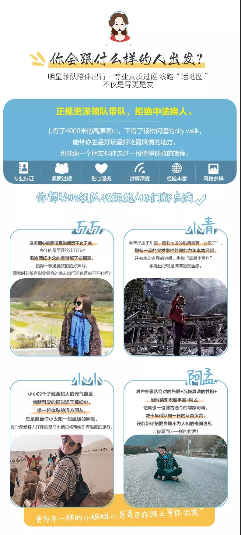 私人訂制:我們業(yè)務(wù)范圍囊括了全國各大城市,川西、西北、東北,在路上永遠(yuǎn)有我們的身影。我們將為每一個(gè)有定制需求的你策劃出獨(dú)屬于自己的完美旅行。