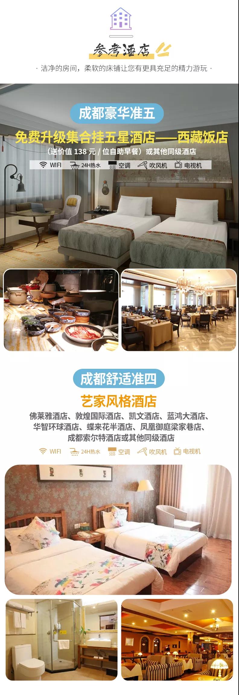 住宿:含4晚住宿;舒適標(biāo)準(zhǔn)全程準(zhǔn)四酒店;豪華標(biāo)準(zhǔn)全程準(zhǔn)五酒店,免費(fèi)升級(jí)2晚成都掛五星酒店。參考酒店如下: