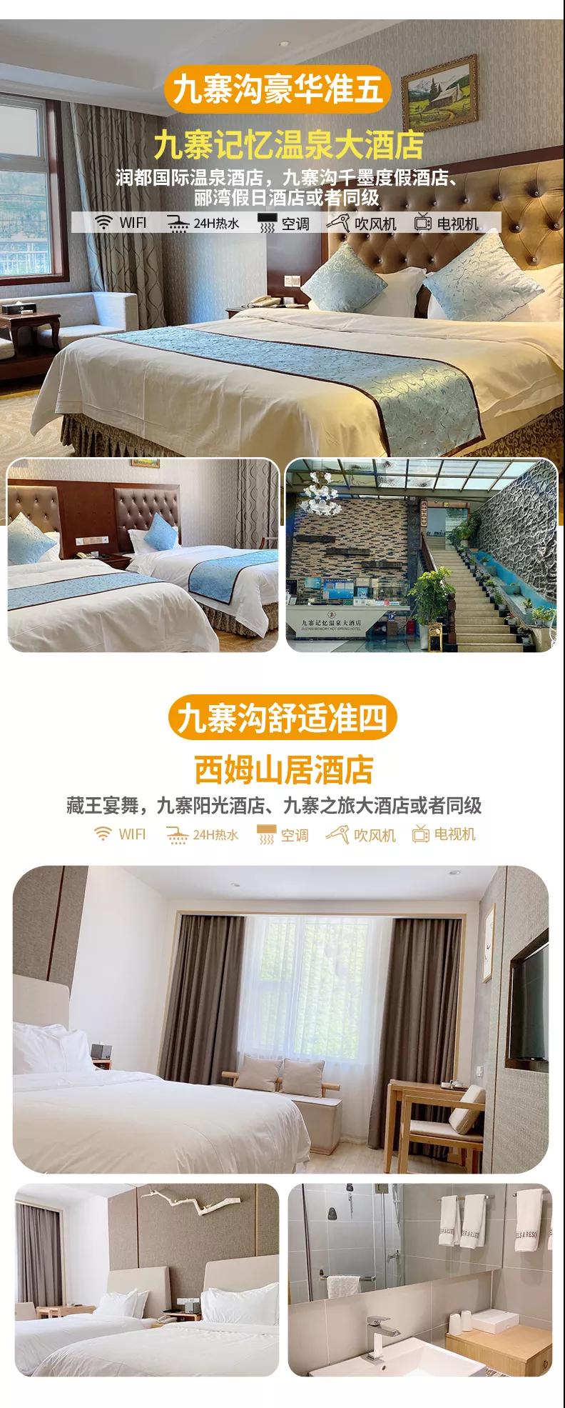 豪華準(zhǔn)五:九寨記憶溫泉大酒店,潤都國際溫泉酒店,九寨溝千墨度假酒店、酈灣假日酒店或者同級(jí)