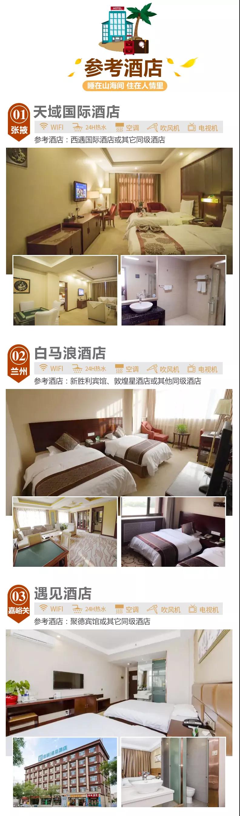 蘭州:白馬浪酒店、新勝利賓館、敦煌星酒店或其他同級酒店