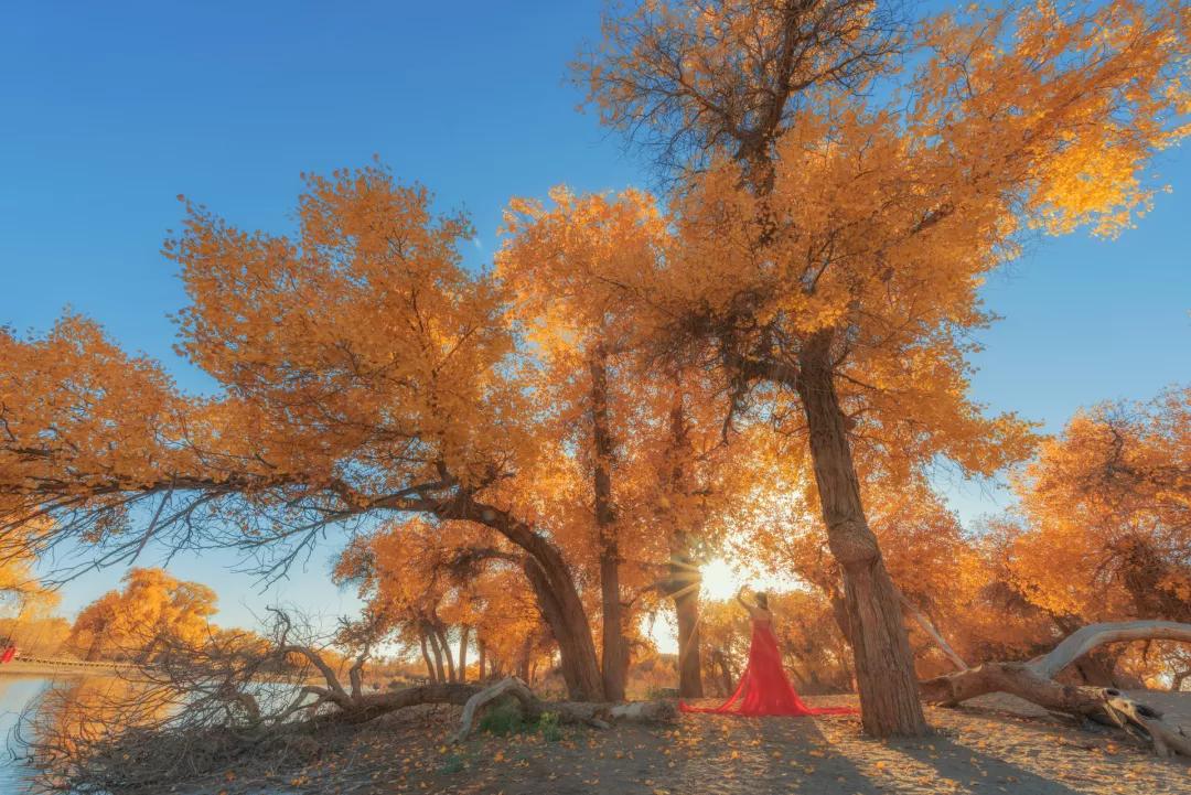 隨后我們在【額濟(jì)納胡楊林景區(qū)】中自行游玩攝影創(chuàng)作,胡楊有“生而一千年不死,死而一千年不倒,倒而一千年不朽”的說法,被世人稱為英雄樹。千姿百態(tài)的胡楊遍布在沙漠中,漫步輝煌的金秋胡楊林,用鏡頭記錄這中國最美的秋景;或者去找尋導(dǎo)游所說的一樹三葉的神奇景象——“幼樹葉如針?biāo)屏?、壯齡樹葉酷似白樺、老年樹葉橢圓”,胡楊、藍(lán)天、來自大漠腹地的風(fēng)聲襲來之時(shí),胡楊林便泛起黃澄澄的層層漣漪,顯盡大西北秋冬那紅盛翠減的獨(dú)有風(fēng)情。張藝謀的大片《英雄》中張曼玉與章子怡身著紅衣在這漫天的金色胡楊中打斗,踱步在胡楊林,熒屏內(nèi)的唯美畫面一一浮現(xiàn)。