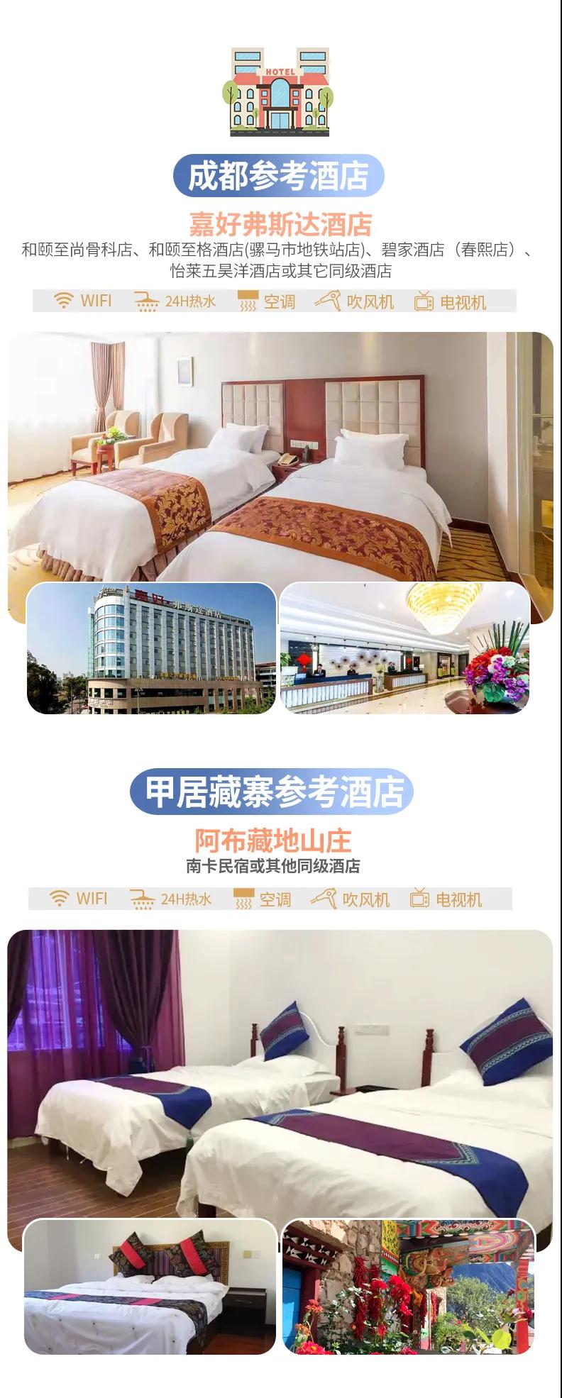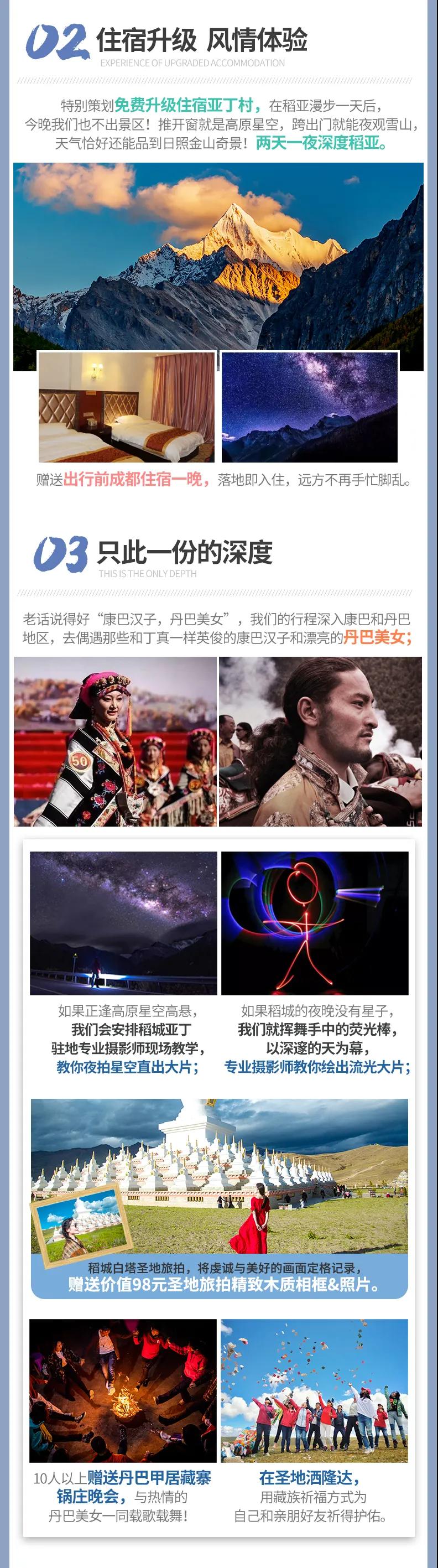 ? 贈(zèng)送:特色贈(zèng)送甲居藏寨藏家晚餐、高原特色牦牛湯鍋;贈(zèng)送旅游三寶、魔術(shù)頭巾、礦泉水緩解旅途疲勞;贈(zèng)送藏地撒隆達(dá);贈(zèng)送價(jià)值98元圣地旅拍精致木質(zhì)相框&照片;贈(zèng)送稻城專業(yè)攝影師現(xiàn)場教學(xué)夜拍星空直出大片,沒有星星時(shí)則教拍流光大片;10人以上贈(zèng)送甲居藏寨篝火晚會(huì);贈(zèng)送成都市區(qū)24小時(shí)接機(jī)/接火車服務(wù);贈(zèng)送項(xiàng)目不用不退。