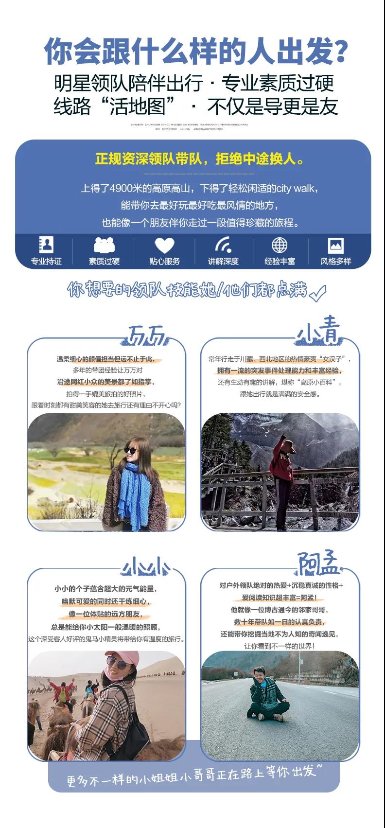 私人訂制:我們客戶范圍囊括了全國各大城市,川西、西北、東北,皖南,貴州,在路上永遠(yuǎn)有我們的身影。我們將為每一個(gè)有定制需求的你策劃出獨(dú)屬于自己的完美旅行。