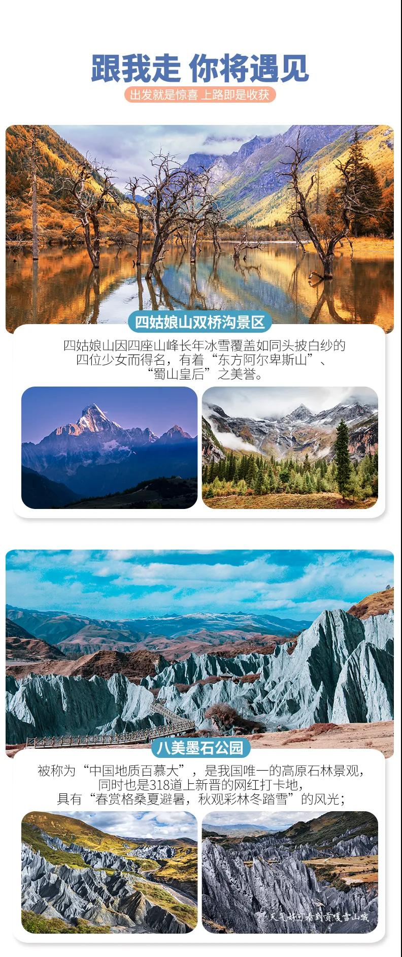 D2 成都 — (約213公里/4.5小時(shí))四姑娘山雙橋溝景區(qū)— (約262公里/8.5小時(shí))丹巴甲居藏寨