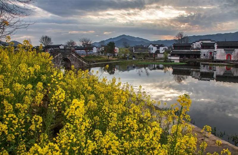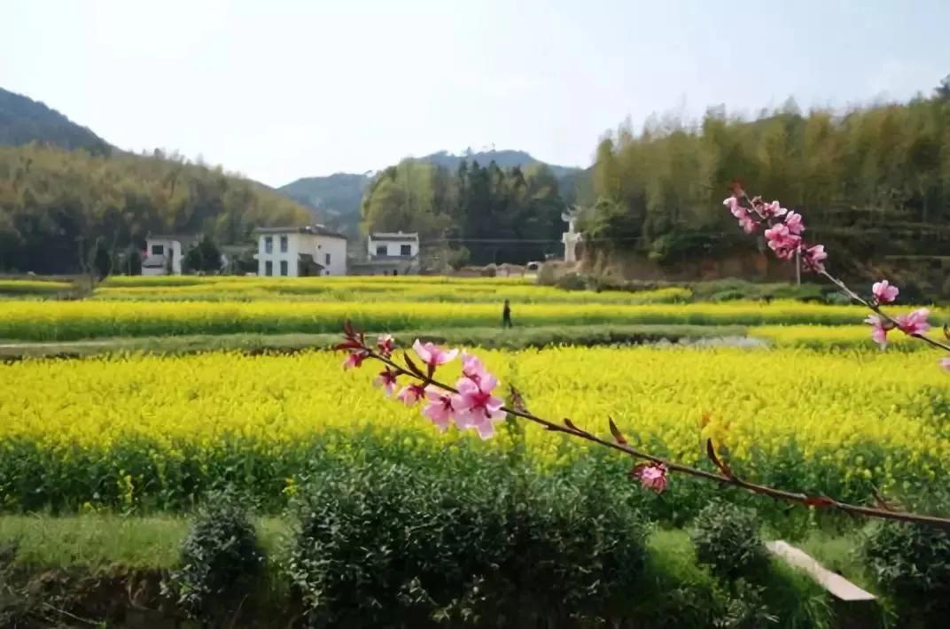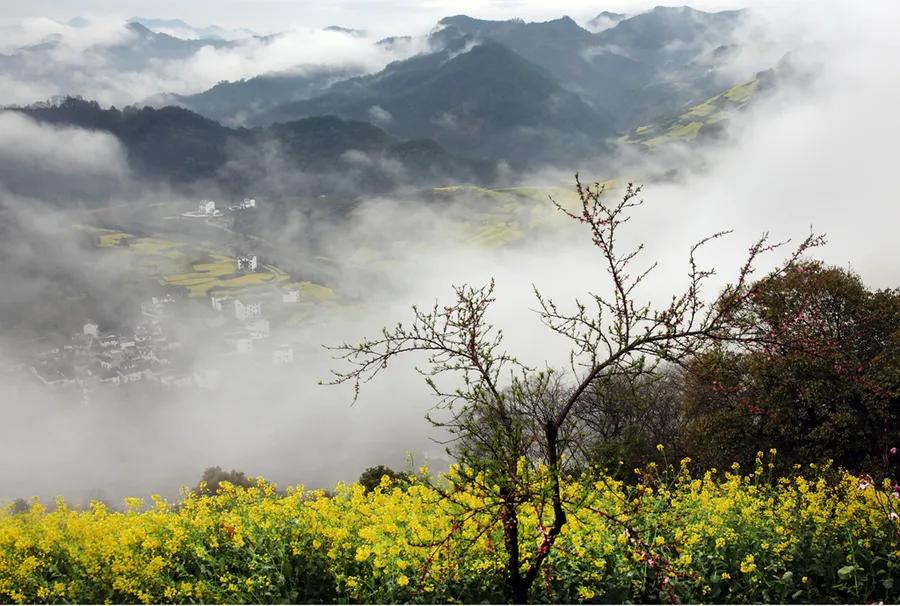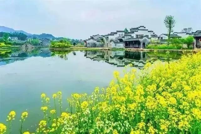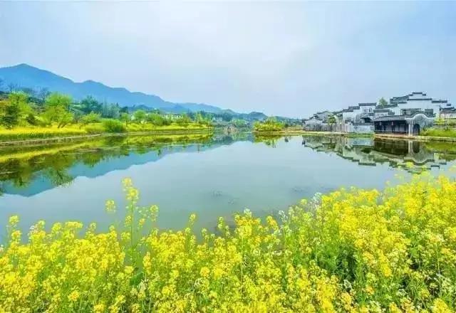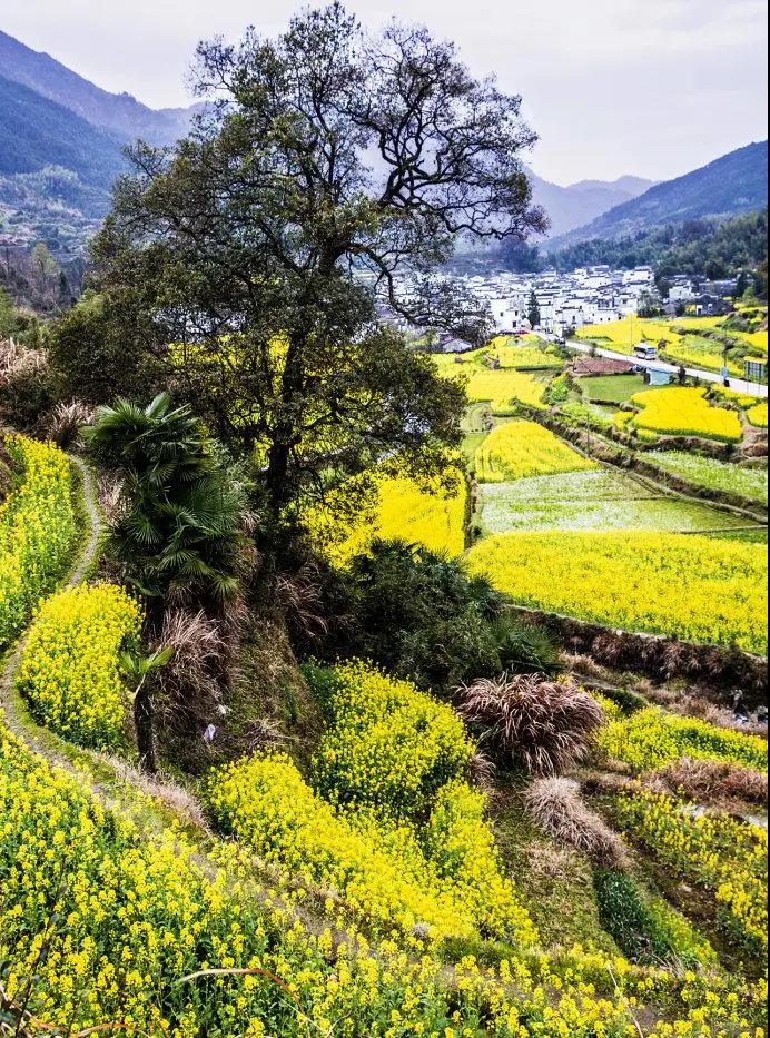 春天來臨時,漫天金黃的油菜花將水墨色的徽派建筑照耀著,白墻青瓦反射著微黃色的光,細看之下,還有幾枝桃花點綴其中。村里裊裊炊煙一直飄到了青色的山上,與山上的煙霧糾纏在一起。這大概才是徽州真正的模樣。