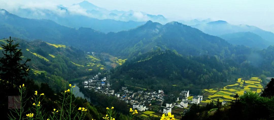 江嶺南臨曉起,東接溪頭,地處婺源縣最東北,是婺源最值得去的地方。站在山頂望去,腳下大片的山谷內(nèi),油菜花層層疊疊,一望無際,中間圍攏著幾個小小的村落,黑瓦白墻的徽派民居夾雜在一片金黃之間。