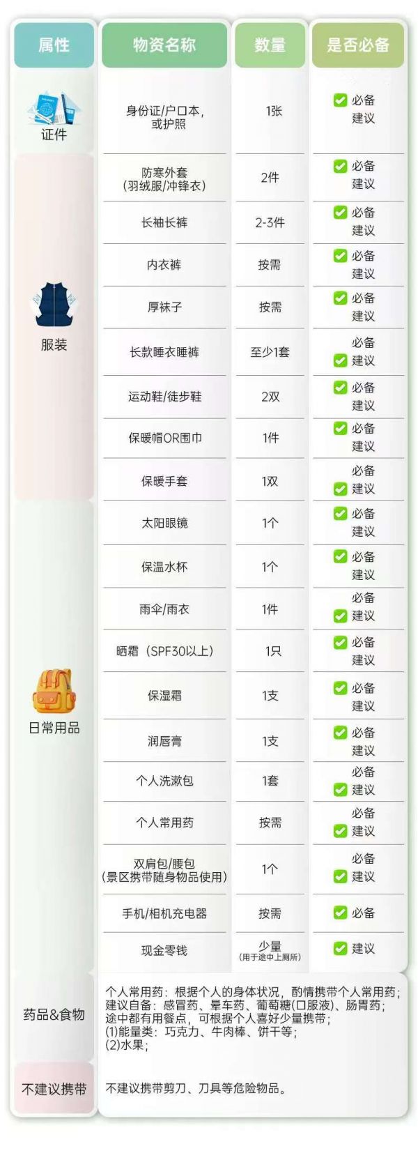 新疆氣候多變,晝夜溫差大,紫外線強(qiáng),請(qǐng)大家務(wù)必注意防寒與防曬,春夏季節(jié)出行,參考以下物品準(zhǔn)備行李: