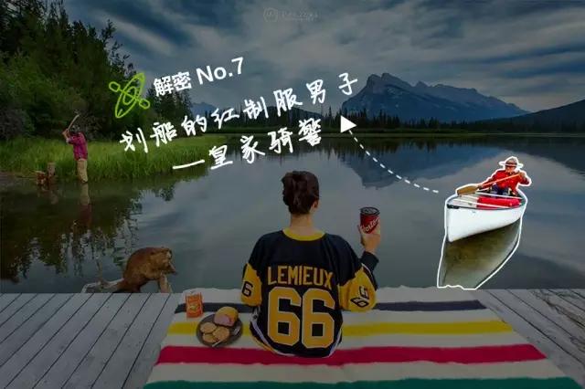 湖面上有一位身著紅色帥氣制服在湖上劃船的男子,他是誰(shuí)呢?原來(lái)是加拿大國(guó)家象征之一:皇家騎警(RCMP)。他表達(dá)出了加拿大人對(duì)落基山戶外探索精神最崇尚的無(wú)限崇尚。